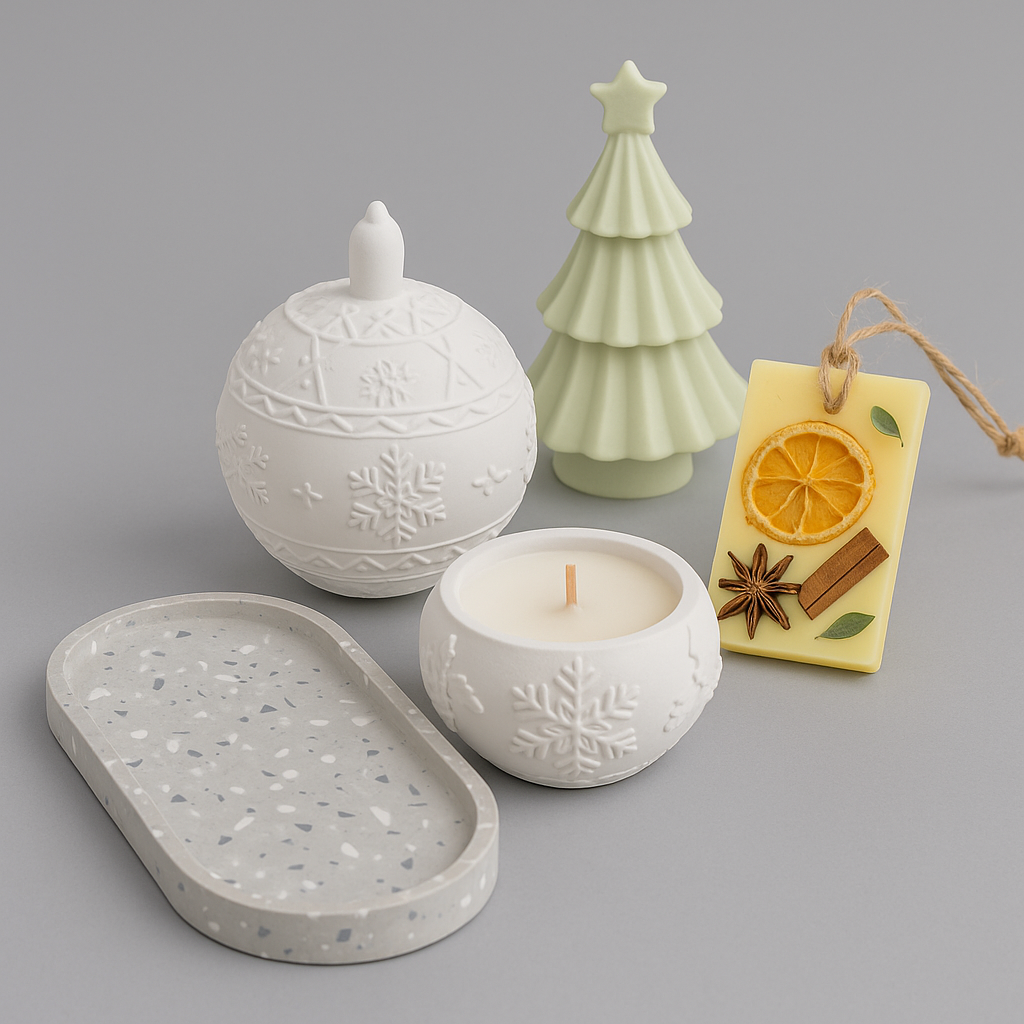 - Naczynko w kształcie bombki z gipsu polimerowego – w wybranym kolorze, które następnie zalejesz woskiem sojowym, tworząc pachnącą świecę w dekoracyjnym pojemniku.